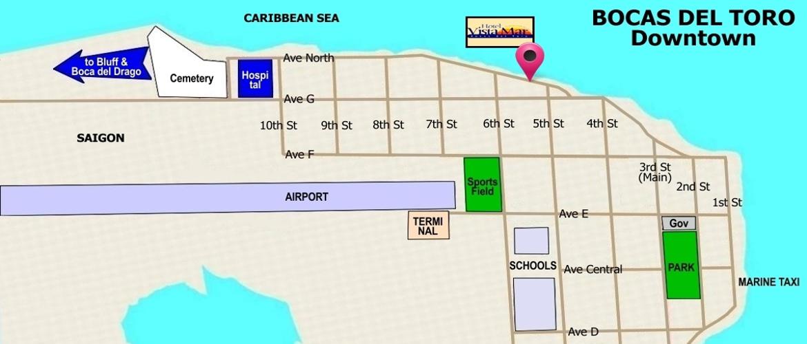 To get to VISTA MAR HOTEL, take a taxi when you arrive to Bocas del Toro and ask to the driver to bring you there.